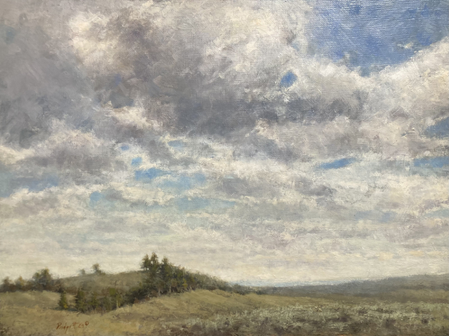 Working alla prima (wet-on-wet) forces you to make choices quickly. It’s a method that thrives on decisiveness and intuition. I laid in the broad values early, mapping out the sweep of the plateau and the anchoring clump of evergreens. The sky—half mood, half light—became the dominant character. Capturing its restless energy meant letting go of control and responding with looseness and texture.